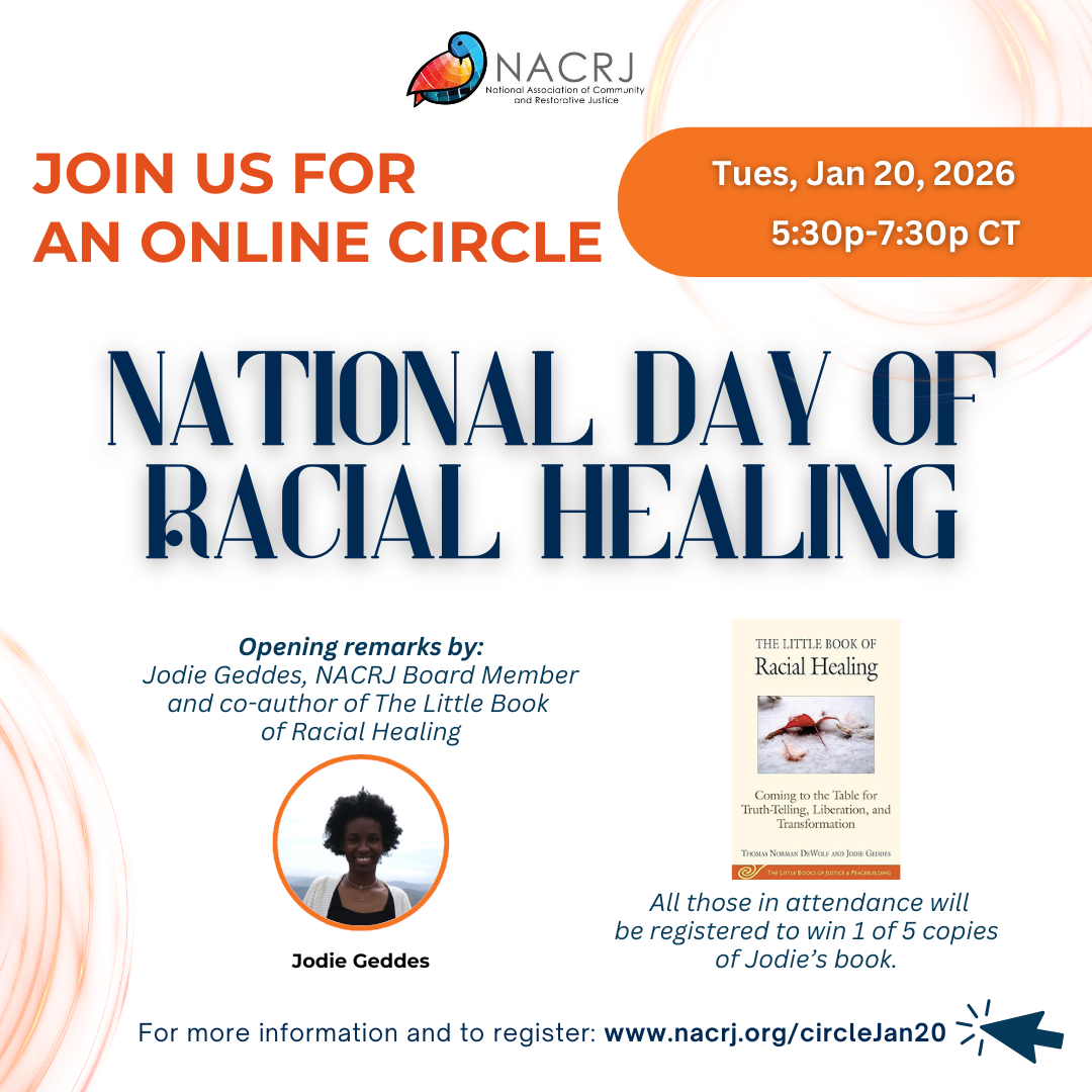 In honor of this day, NACRJ will host a circle gathering on January 20, 2026. The gathering will feature opening comments by members of NACRJ’s DEIJ Committee, as well as Jodie Geddes, NACRJ Board Member and co-author of The Little Book of Racial Healing. As with our other online circles, the majority of our time together will be spent in small group circles focused on connection among attendees. All those in attendance will be entered into a drawing to win one of five copies of Jodie’s book as a door prize.
