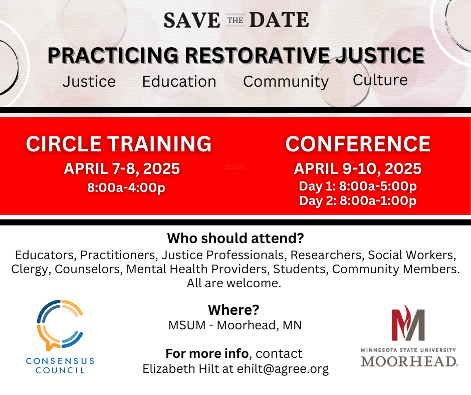 SAVE THE DATE: Practicing Restorative Justice Conference at Minnesota State University-Moorhead in April 2025. Registration will open in mid to late January.